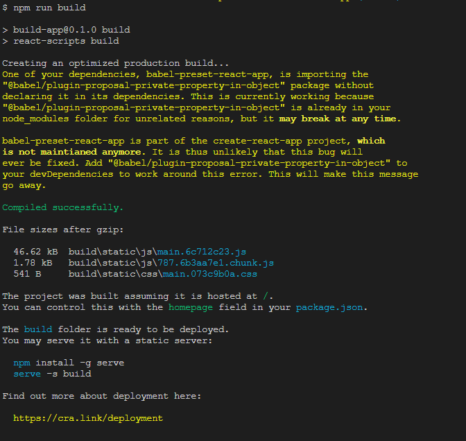 위에서 먼저 말씀드렸다시피 빌드는 간단하게 npm run build 명령어로 진행할 수 있습니다.